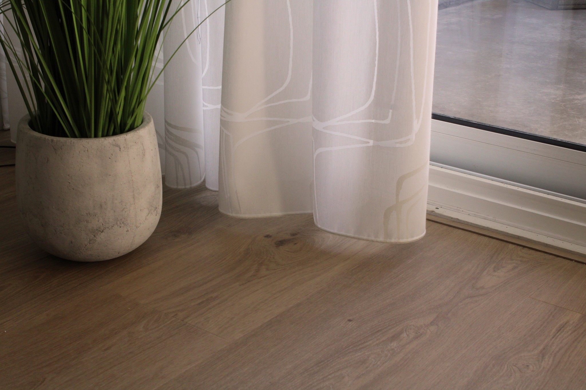 Leuke combinatie: Floorify click PVC Cider en Toppoint gordijnstof Retro